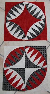 … sind hier mal die ersten beiden Viererblöcke des Rattlesnake-Quilts: